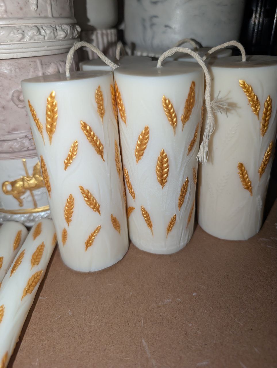 "Колосок" L - декоративна свічка без запаху, створена для тих, хто любить атмосферу полум'я і стильні деталі в інтер'єрі, але не хоче жодних ароматів. Рельєфні колоски з золотим акцентом роблять її виразною і святковою, а білий колір залишається універсальним для будь-якого простору.