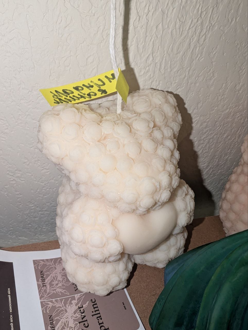 "Квітковий мішка" - це декоративна свічка-фігурка з рельєфною фактурою пелюсток, яка одразу працює як подарунок. Вона красиво виглядає у композиціях, на підносі, комоді або біля книжкової полички, і додає простору м'який “святковий” акцент.