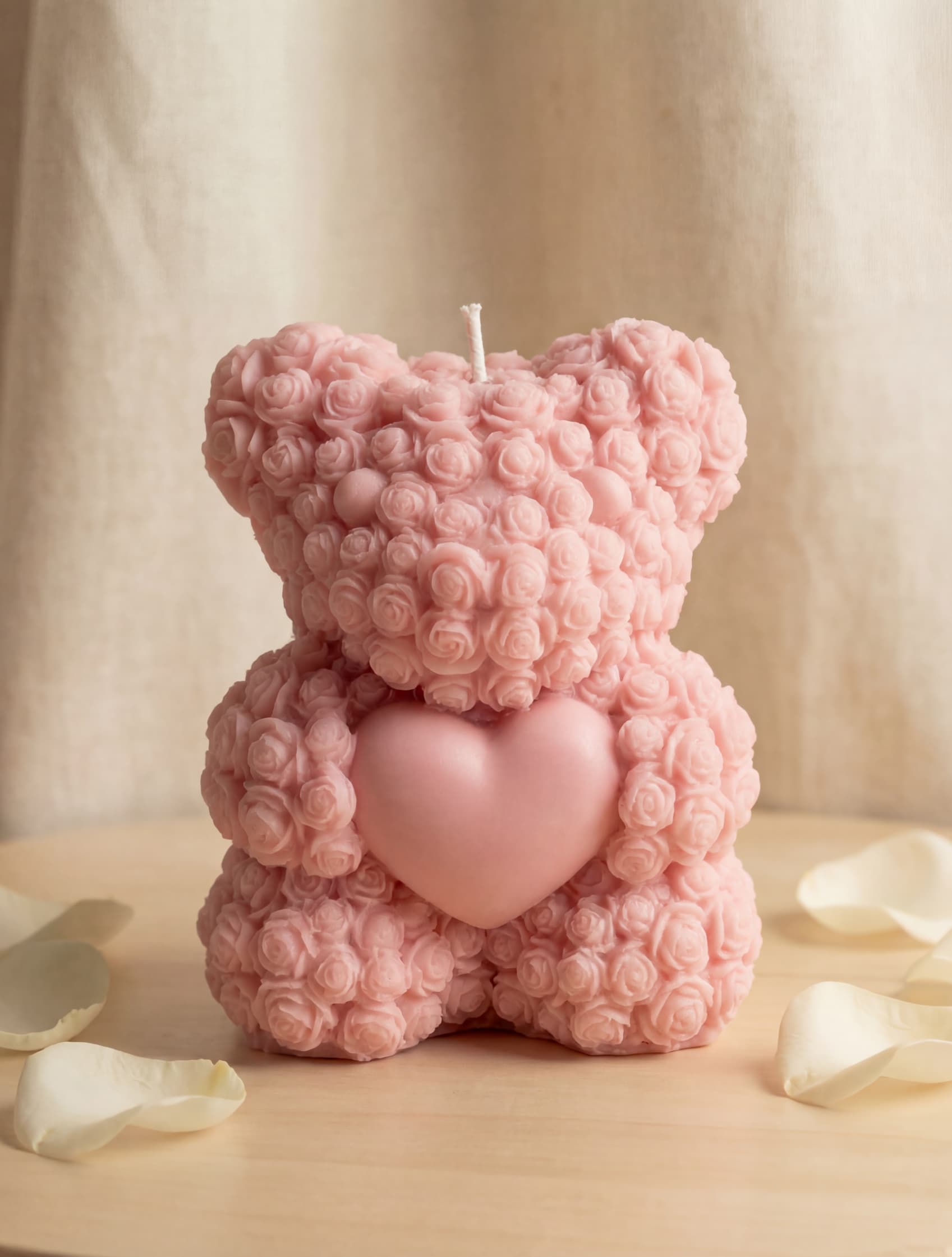 "Квітковий мішка" - це декоративна свічка-фігурка з рельєфною фактурою пелюсток, яка одразу працює як подарунок. Вона красиво виглядає у композиціях, на підносі, комоді або біля книжкової полички, і додає простору м'який “святковий” акцент.