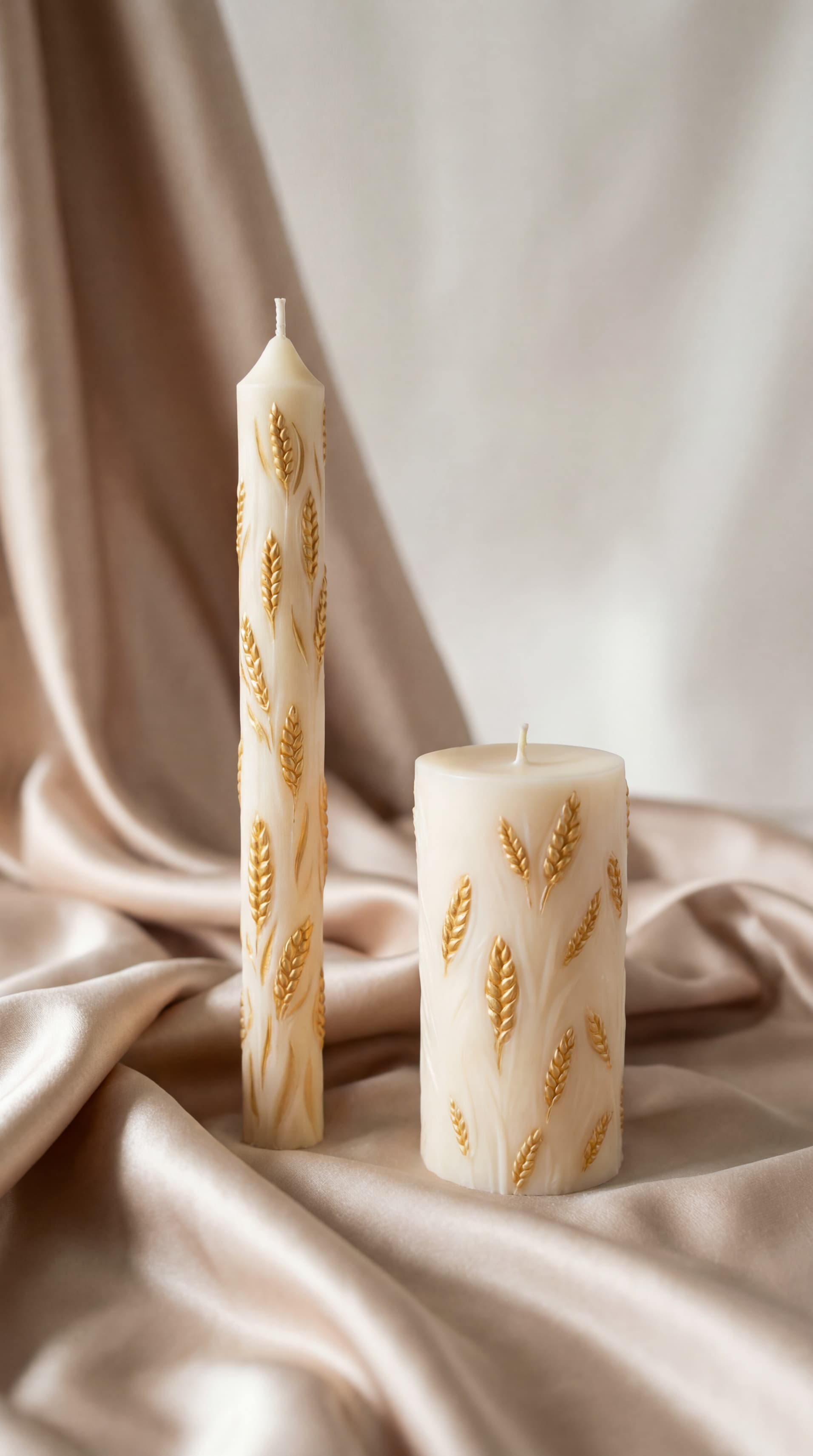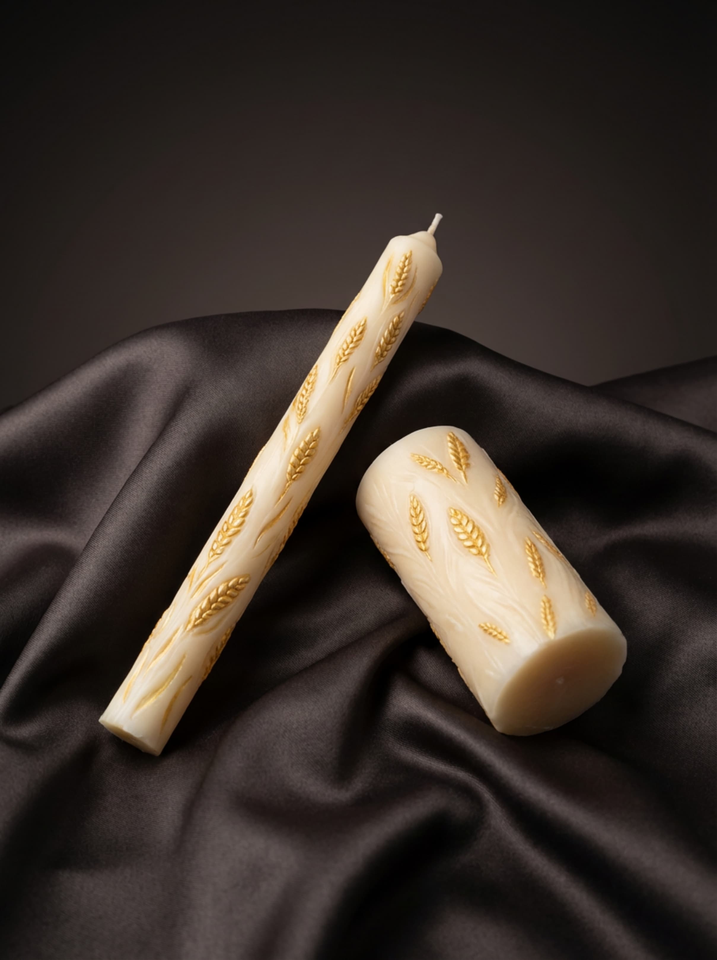 "Колосок" M - декоративна свічка без запаху, створена для тих, хто любить атмосферу полум'я і стильні деталі в інтер'єрі, але не хоче жодних ароматів. Рельєфні колоски з золотим акцентом додають святкового настрою, а білий колір залишається універсальним для будь-якого простору.
